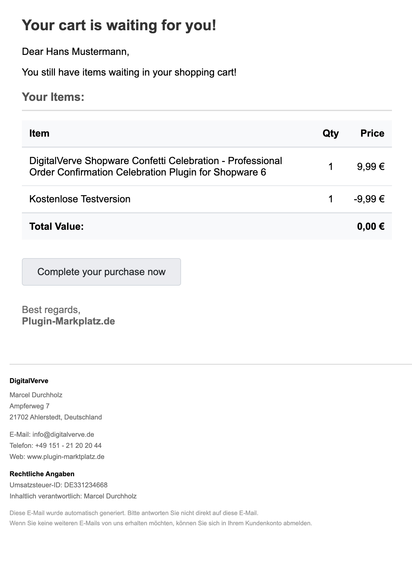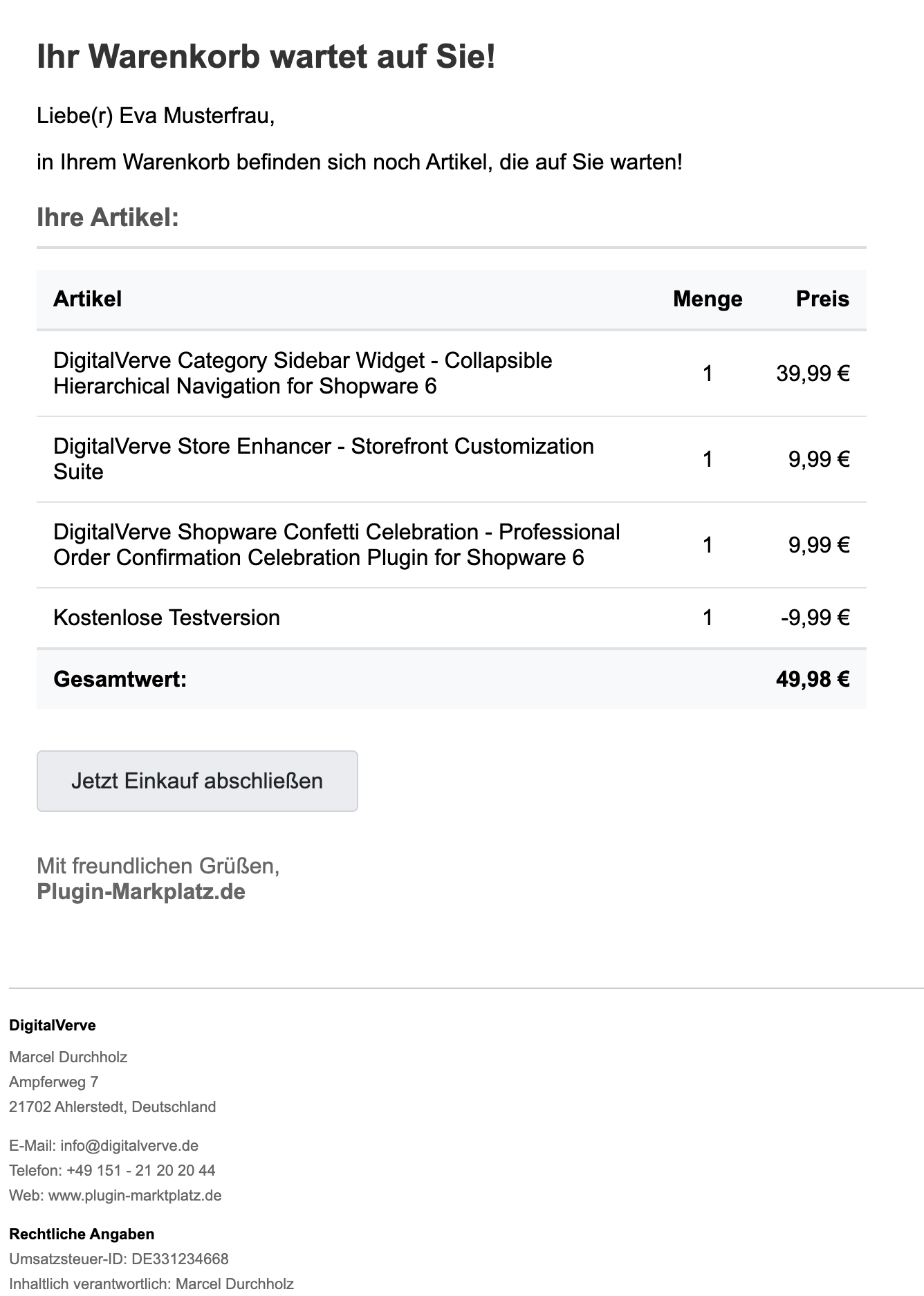 Entwickelt von DigitalVerve - Als erfahrener Shopware-Partner bringt DigitalVerve jahrelange Expertise in der Plugin-Entwicklung mit. DvShopwareAbandonedCarts folgt allen Best Practices für Shopware 6 und wird regelmäßig aktualisiert.