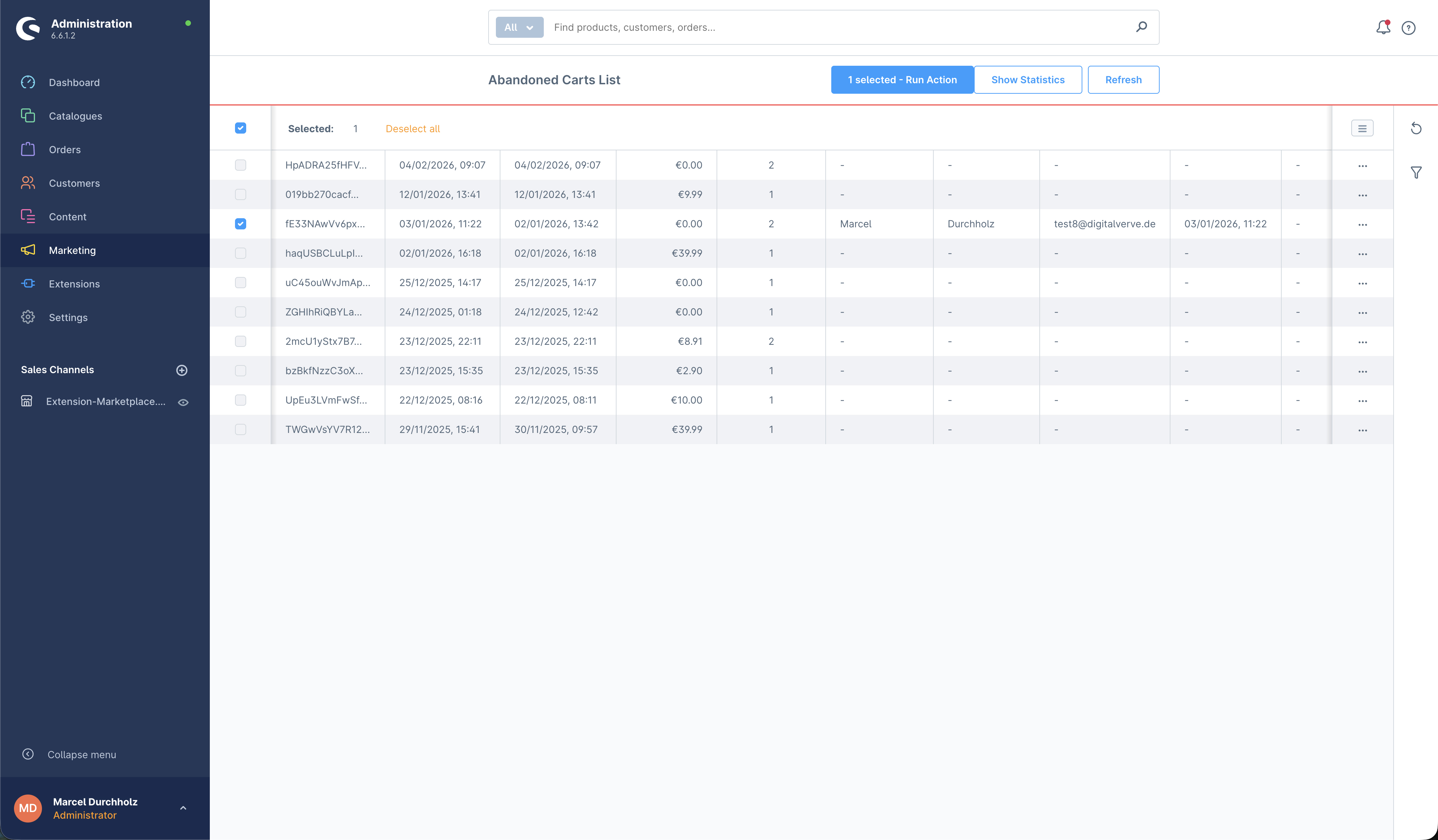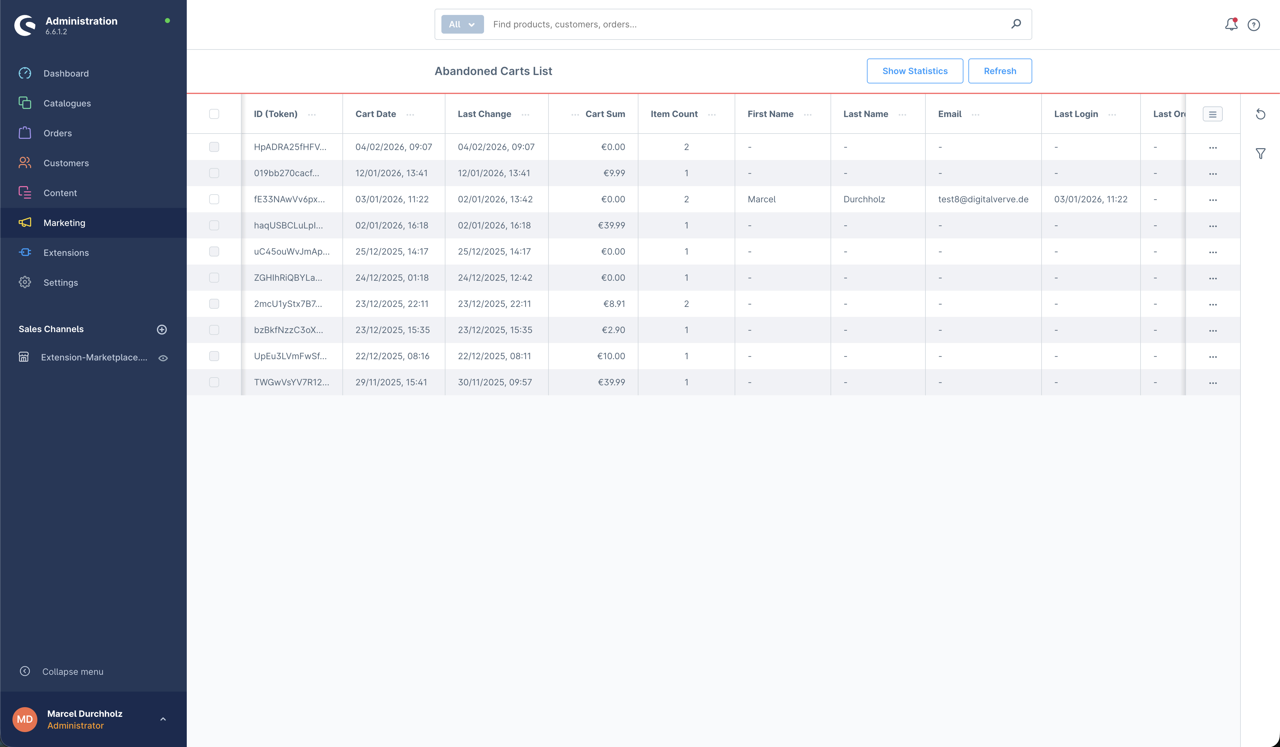 Warenkorbabbrecher verstehen und zurückgewinnen - Mit DvShopwareAbandonedCarts erhalten Sie ein leistungsstarkes Werkzeug zur Identifikation und Verwaltung von Warenkorbabbrechern in Ihrem Shopware 6 Shop. Verstehen Sie, warum Kunden ihren Einkauf nicht abschließen und ergreifen Sie gezielte Maßnahmen zur Umsatzsteigerung.