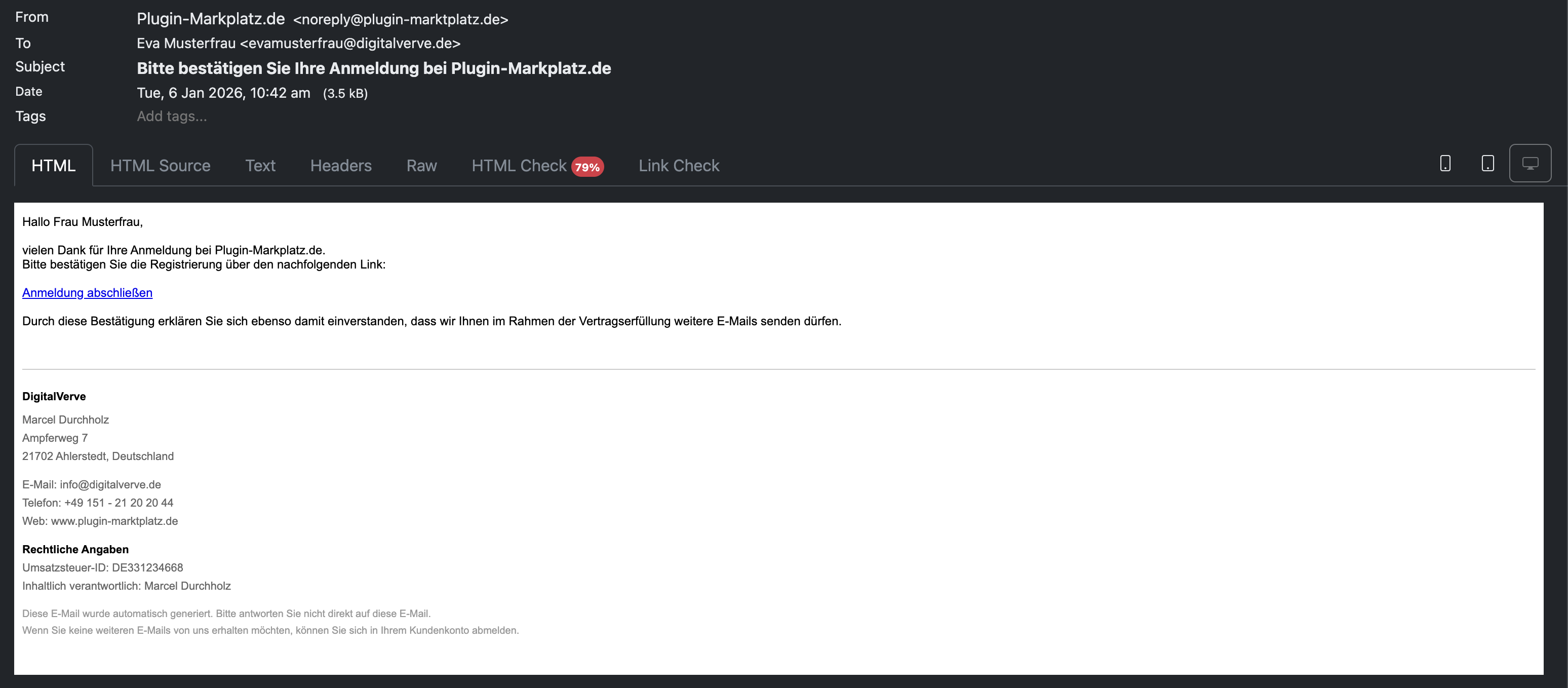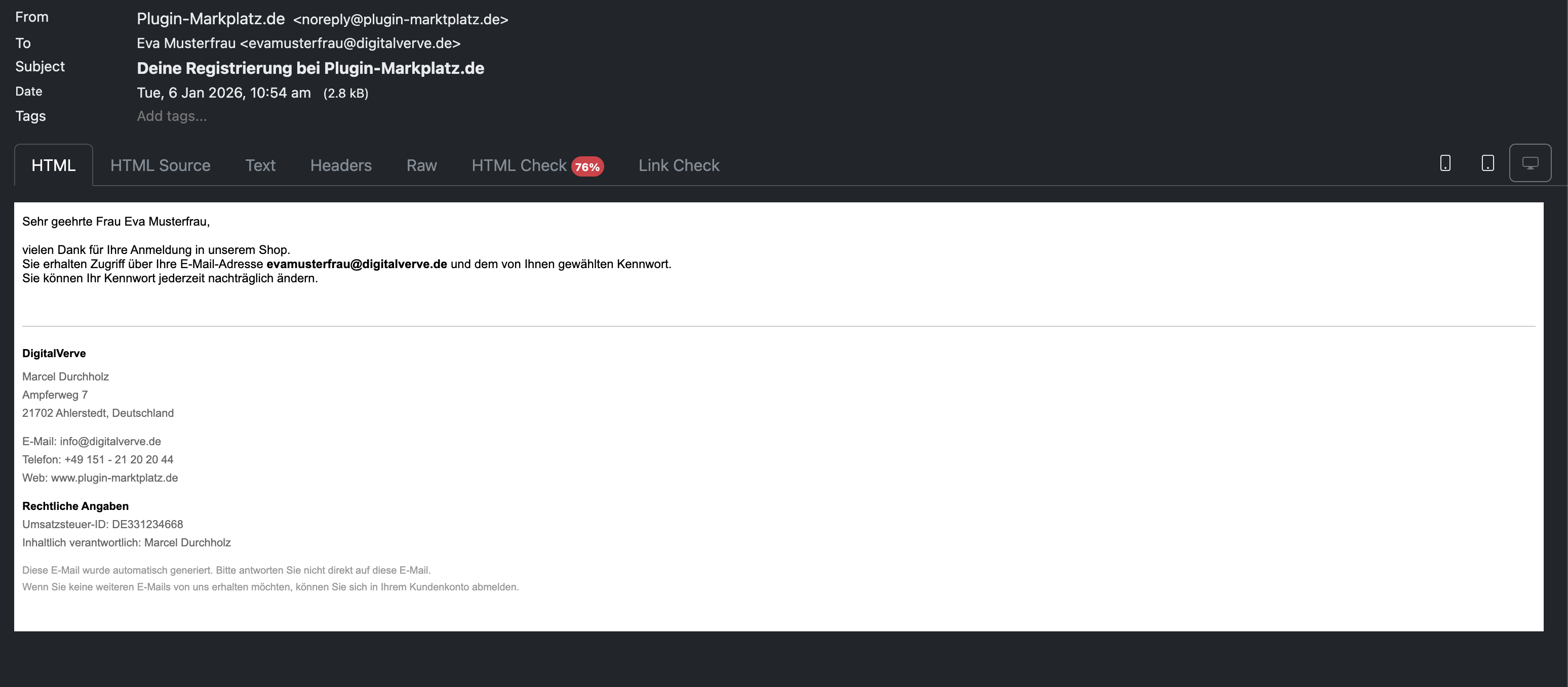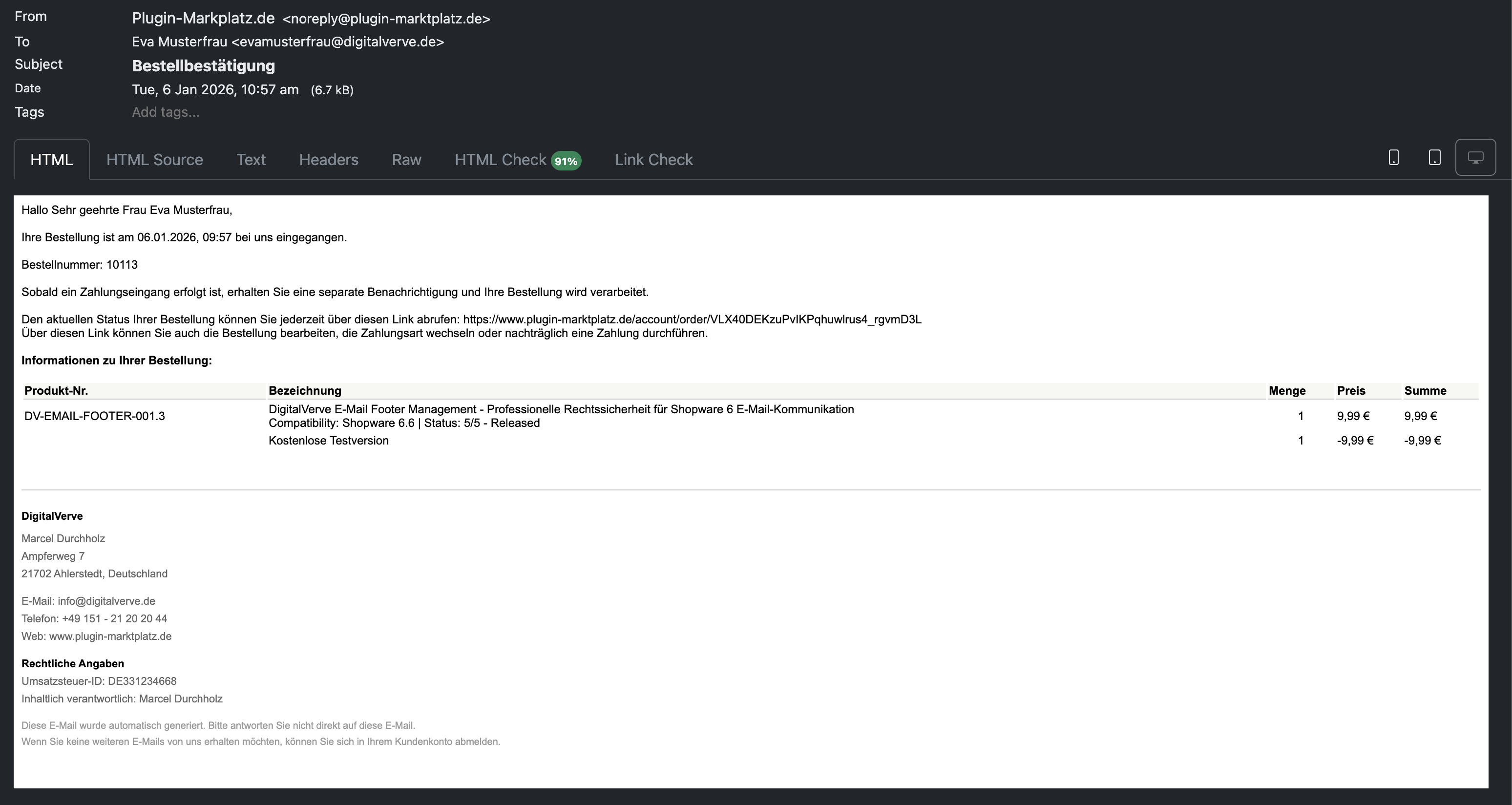 Das DigitalVerve E-Mail Footer Management Plugin revolutioniert die Art und Weise, wie Online-Shops mit der rechtlichen Compliance in der E-Mail-Kommunikation umgehen. Durch die Implementierung einer ausgeklügelten Event-gesteuerten Architektur fängt das Plugin nahtlos alle ausgehenden E-Mails ab – von Bestellbestätigungen und Versandbenachrichtigungen bis hin zu Passwort-Resets und Kundenkommunikationen – und fügt automatisch einen professionell formatierten Footer mit Ihren wesentlichen Geschäftsinformationen an.