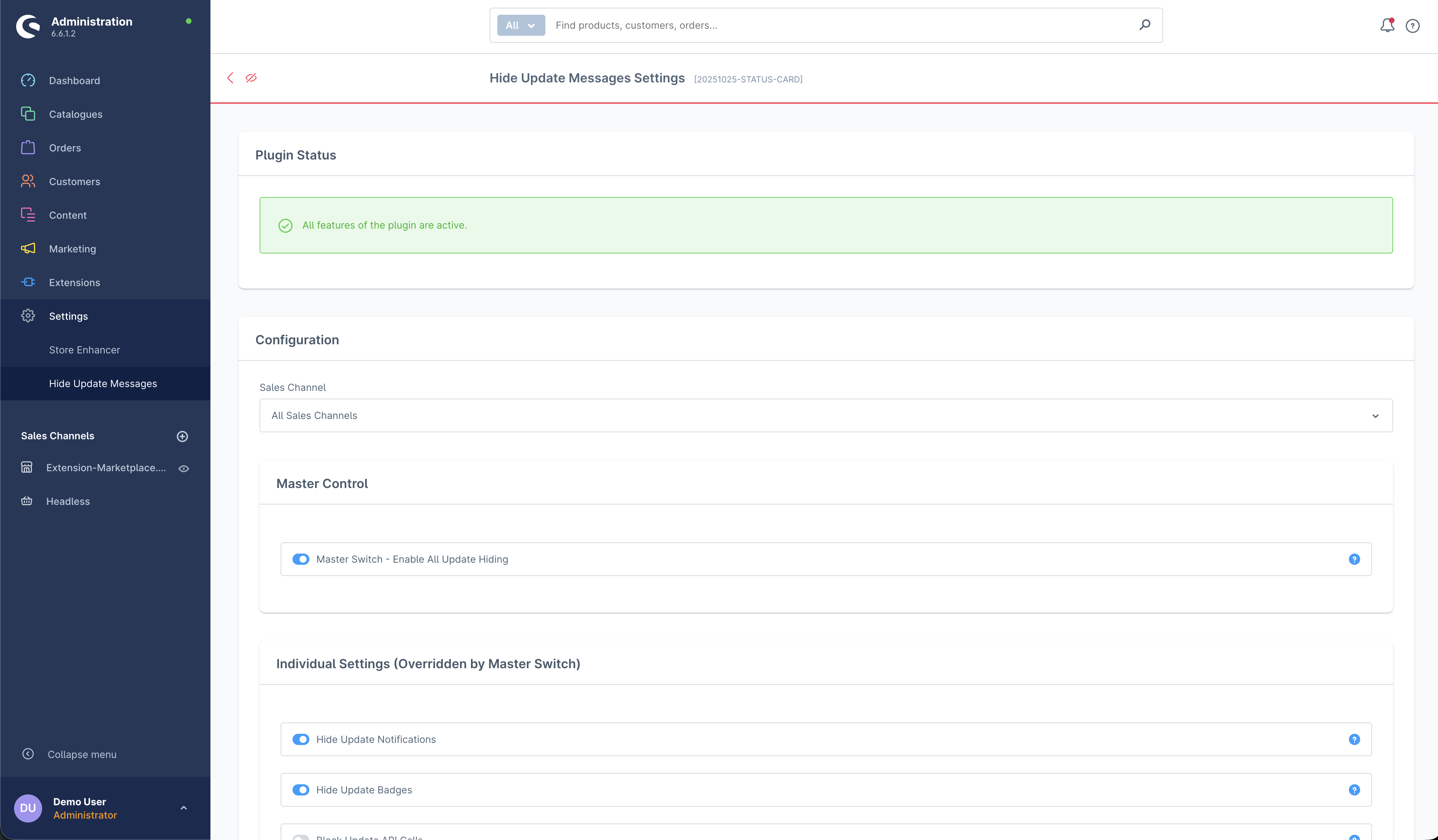 Das Hide Update Messages Plugin bietet Ihnen die vollständige Kontrolle über Update-Benachrichtigungen in Ihrer Shopware 6 Administration. Mit dieser durchdachten Lösung können Sie störende Update-Hinweise ausblenden und schaffen so eine fokussierte Arbeitsumgebung für Ihr Team. Das Plugin arbeitet mit einem intelligenten Master-Switch-System, das Ihnen ermöglicht, alle Update-bezogenen Elemente mit einem einzigen Klick zu kontrollieren, während individuelle Einstellungen für granulare Anpassungen zur Verfügung stehen.